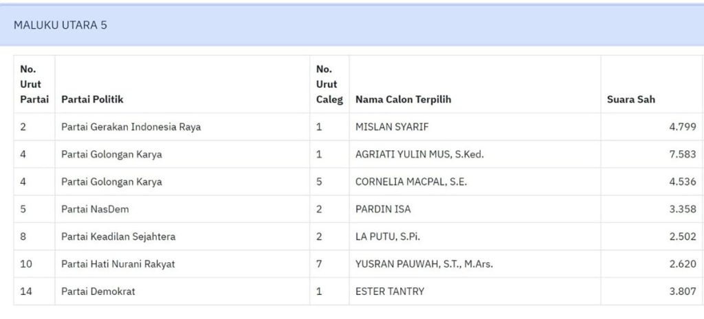 Berikut daftar nama anggota DPRD Maluku Utara terpilih: