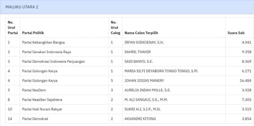 Dari 45 kursi DPRD Malut, Partai Golkar mampu menempatkan delapan kadernya di parlemen, kemudian PDIP, Nasdem, PKS dan Hanura 5 kursi, Gerindra dan PKB 4 kursi, Demokrat dan PAN 3 kursi serta Partai Garuda, PBB dan Perindo masing-masing meraih 1 kursi.
