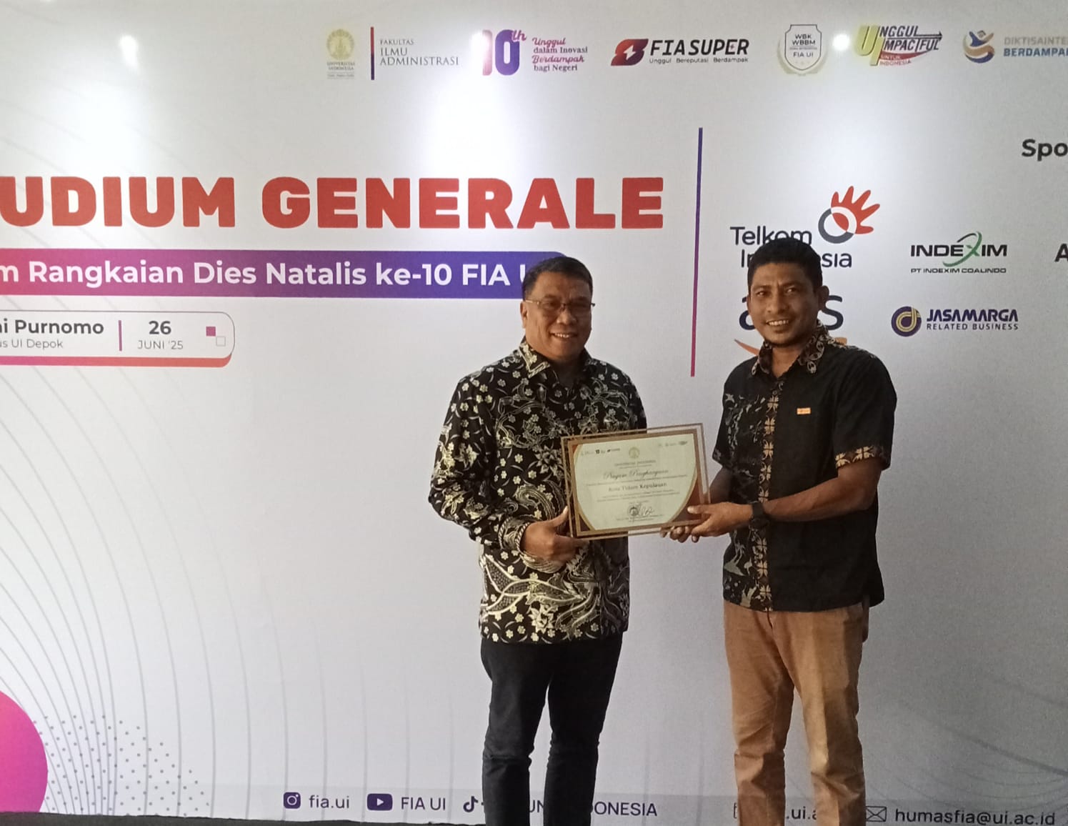 Penghargaan tersebut diserahkan oleh Dekan Fakultas Ilmu Administrasi UI Prof. Dr. Dra. Retno Kusumastuti Hardjono kepada Sekretaris Daerah Kota Tidore Kepulauan H. Ismail Dukomalamo dalam acara Studium Generale Dies Natalies FIA UI ke-10, di Gedung Balai Purnomo, Depok, Kamis 26 Juni 2025