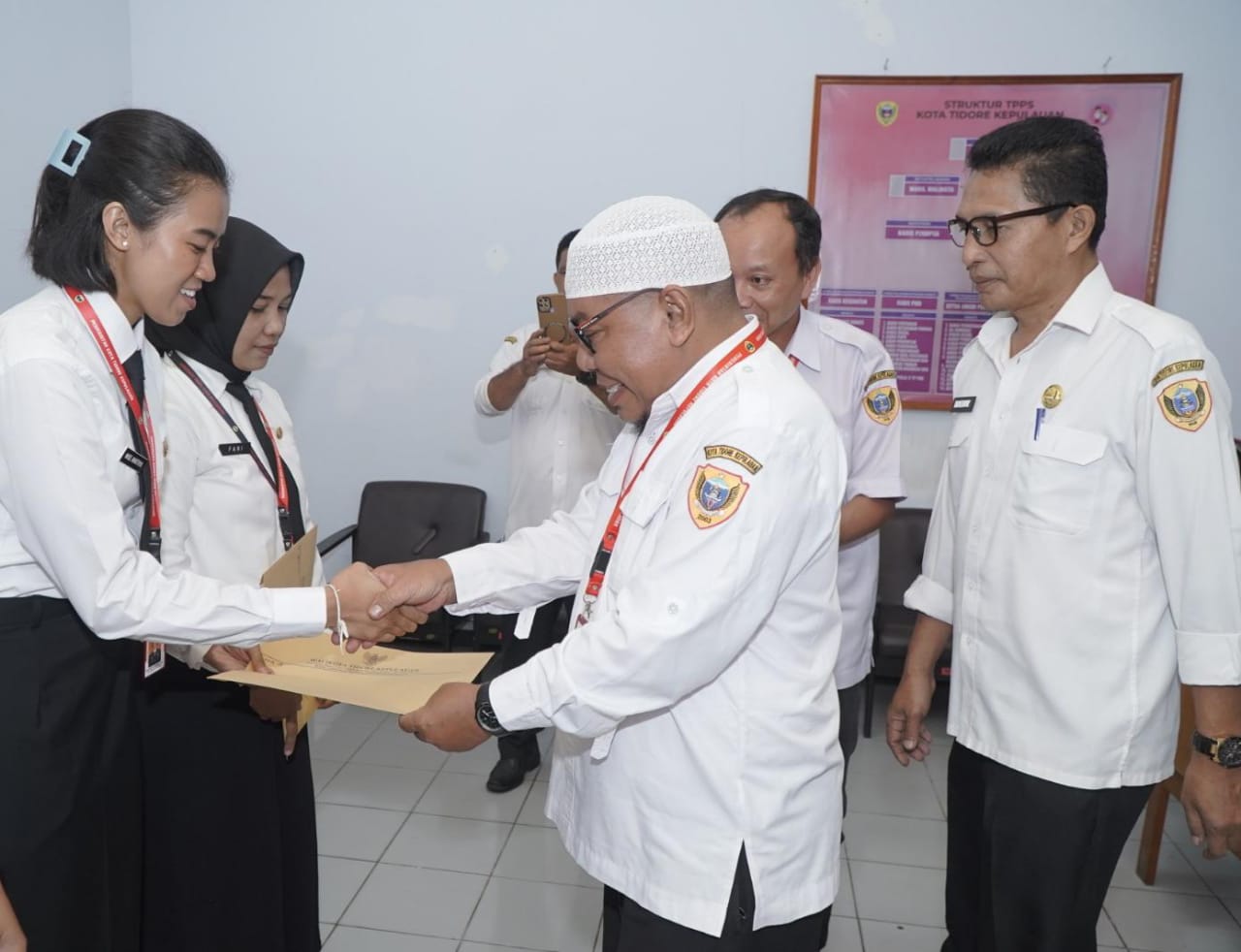 TIDORE – Mewakili Walikota, Pelaksana Harian (Plh) Sekretaris Daerah Kota Tidore Kepulauan H. Yakub Husain menyerahkan surat keputusan (SK) Walikota 80 persen kepada 5 orang Calon Pegawai Negeri Sipil (CPNS) Sekolah Tinggi Transportasi Darat (STTD), di ruang kerja Plh Sekda, Rabu (26/6/24).