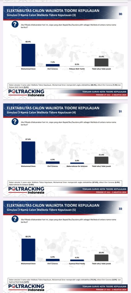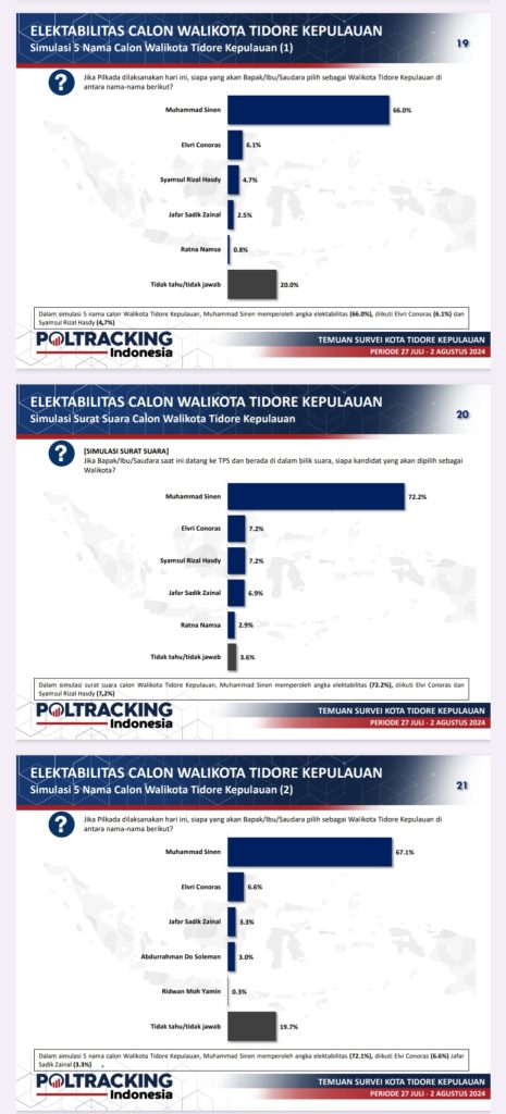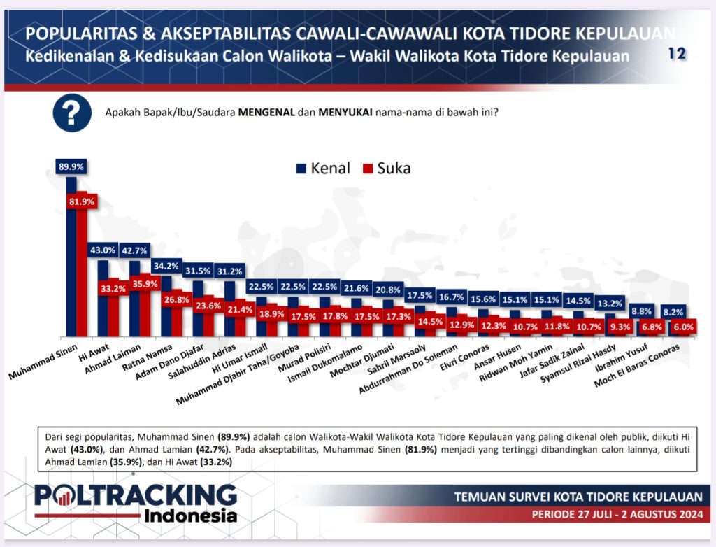 BARU-baru ini Poltracking Indonesia telah merilis hasil survei untuk Pilkada serentak 2024 khususnya wilayah Pemilihan Kota Tidore Kepulauan (Pilwako-Tikep), sekitar 17 nama tokoh dan calon kandidat yang disurvei, bahkan Poltracking juga memasukan nama Sultan Tidore dan Beni Laos yang hari ini digadang-gadang sebagai calon kandidat gubenur Maluku Utara.