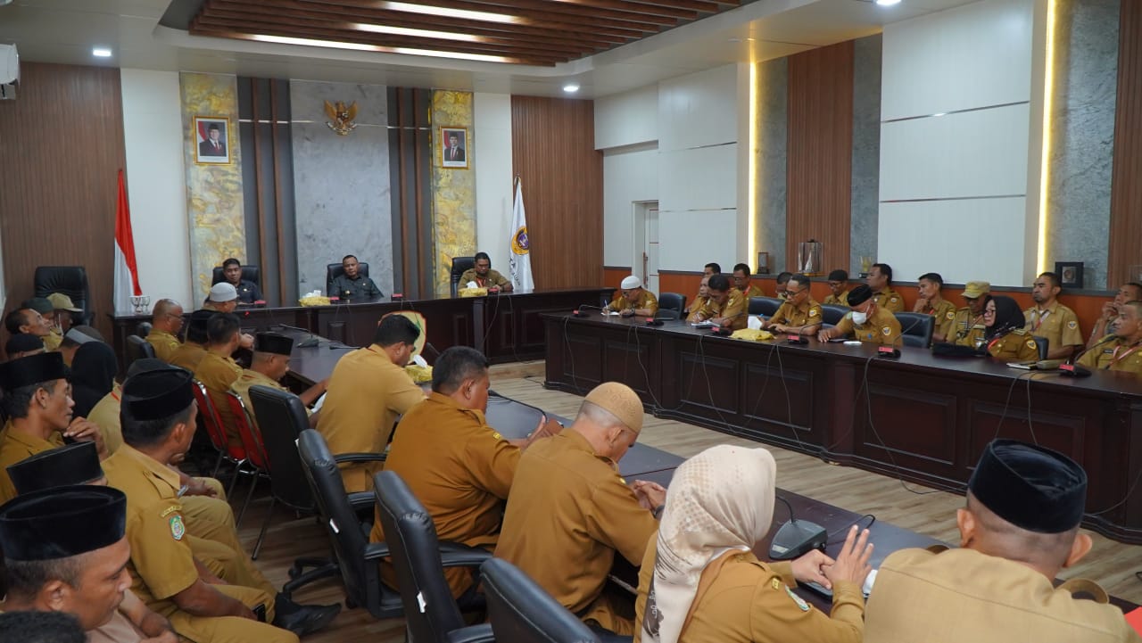 TIDORE- Walikota Tidore Kepulauan Muhammad Sinen didampingi Wakil Wali Kota Tidore Kepulauan Ahmad Laiman memimpin rapat koordinasi bersama para Camat dan Kepala Kelurahan se Kota Tidore Kepulauan, Selasa (11/3/25).