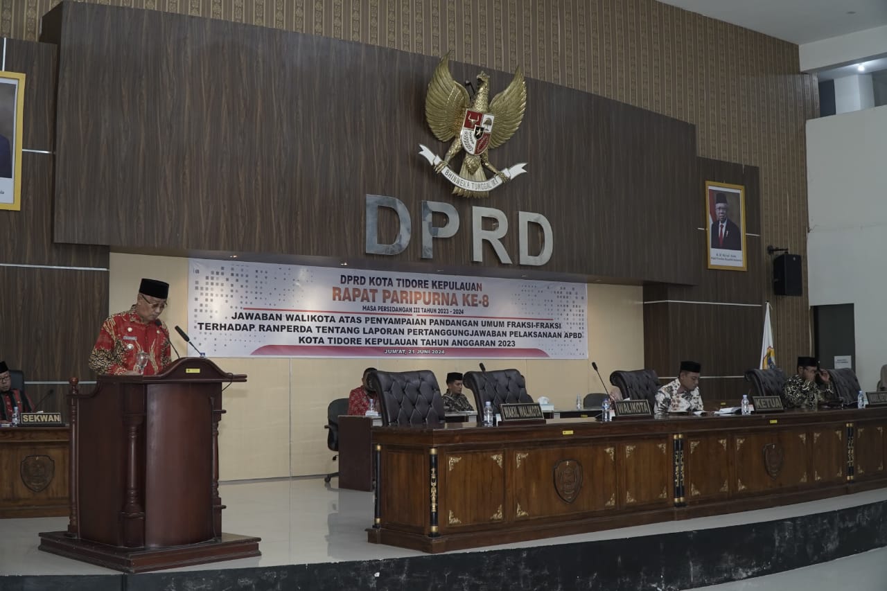 TIDORE – Wali Kota Tidore Kepulauan Capt H. Ali Ibrahim menyampaikan jawaban Wali Kota atas Pandangan Umum Fraksi-Fraksi Terhadap Ranperda tentang Laporan Pertanggungjawaban Pelaksanaan APBD Kota Tidore Kepulauan Tahun Anggaran 2023 pada Rapat Paripurna ke-8 Masa Persidangan III Tahun 2023-2024, di Gedung DPRD Tidore, Sabtu (22/6/24) Malam.
